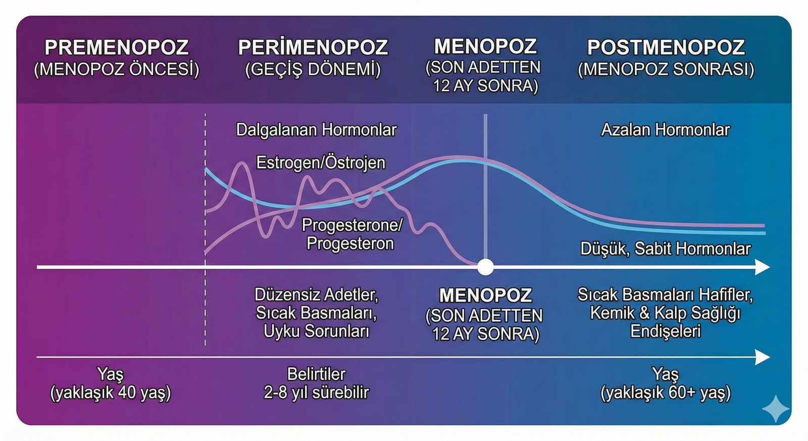 Menopoz süreci bir gecede gerçekleşmez; genellikle birkaç yıla yayılan dört temel evreden oluşur: